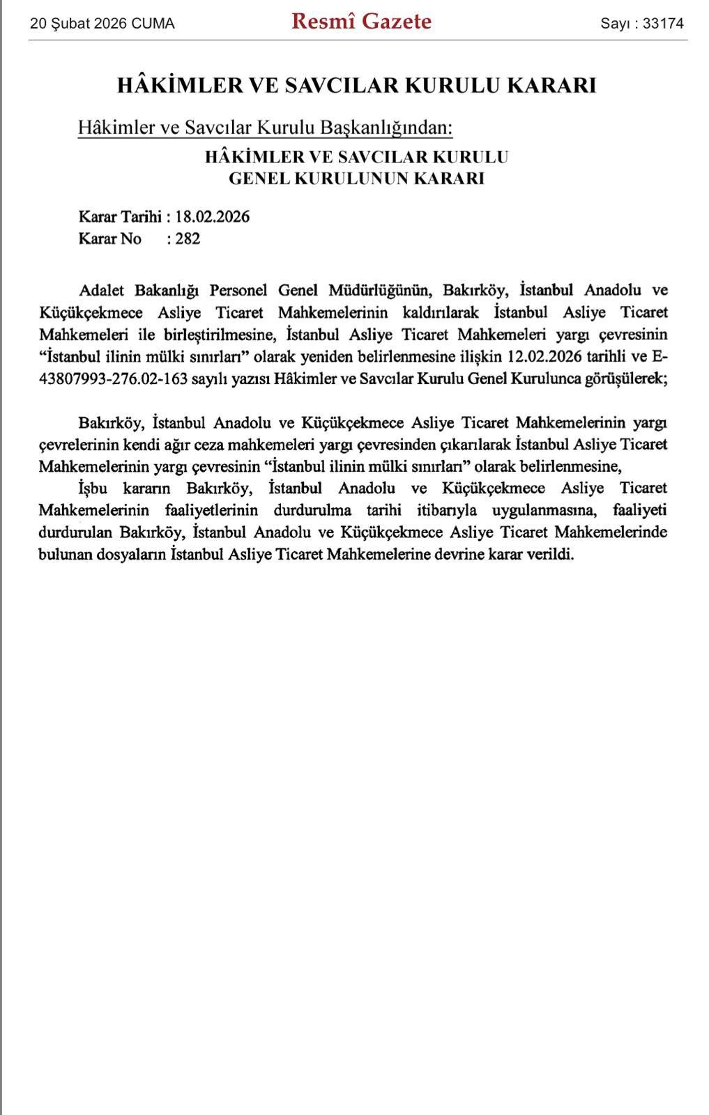 20 Şubat 2026 tarihli Resmî Gazete ’de yayımlanan Hâkimler ve Savcılar Kurulu (HSK) Genel Kurulu’nun 282 Sayılı Kararı ile İstanbul’daki ticari yargılamada kritik bir yapısal değişikliğe gidildi. İstanbul’un farklı yakalarında hizmet veren pek çok Asliye Ticaret Mahkemesi kapatılarak tek bir merkezde toplandı. Bu uygulamanın getireceği avantaj ve dezavantajlar hukuk camiası tarafından en önemli gündem olarak tartışmalara konu edilmeye derhal başlandı.
